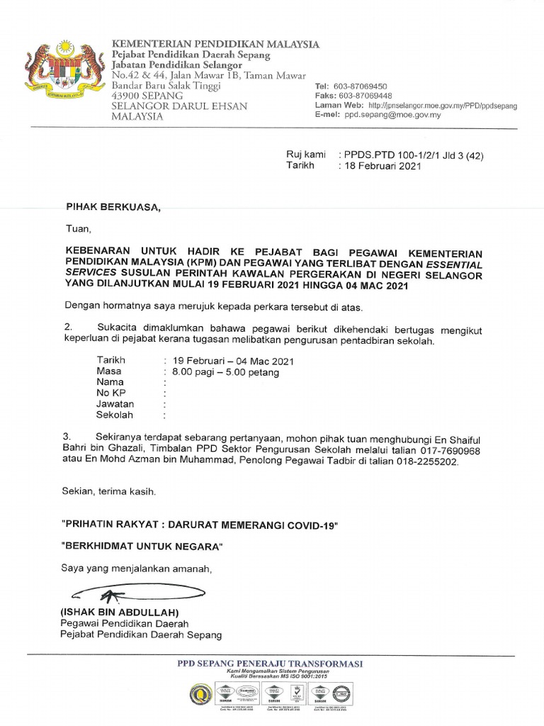 Selepas siap pihak lelaki kena bawa borang yang siap print dan hiv test ke tok imam kariah pihak lelaki dan mintak sign di dalam borang. Dato' rosmarayu bt mokhtar 3. Kerajaan digesa beri bantuan rm1,200 sebulan buat rakyat. Jika anda perlu hadir ke pejabat atau merentas daerah/negeri ketika pkp/pkpb kerana urusan penting, disini kami sediakan contoh surat pelepasan bekerja pkpb / pkp & borang permit rentas negeri untuk rujukan. Surat kebenaran perjalanan untuk membeli, menjual, mengalih, menguji dan menyiasat keluaran kelapa sawit di seluruh negara semasa tempoh lanjutan perintah kawalan pergerakan (pkp 3.0) fasa 1 serta peringatan mematuhi prosedur operasi standard (sop) oleh majlis keselamatan negara (mkn) dan kementerian kesihatan malaysia (kkm) dengan hormatnya.